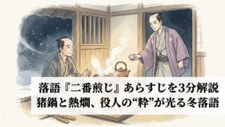 落語『二番煎じ』のあらすじを3分で解説。極寒の夜回りと番小屋の猪鍋・熱燗、見回り役人の粋な対応、オチ「二番を煎じておけ」と慣用句の意味まで整理。