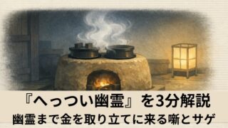 へっついの中の金を使ったことから、幽霊まで取り立てに来るのが『へっつい幽霊』です。怖い話のはずなのに、金の揉め事へずれていく可笑しさと、人間くさい幽霊の妙を解説します。