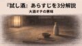 落語『試し酒』のあらすじと大酒オチを3分で解説。五升という異常な量の意味、サゲの「表の酒屋で練習」の面白さ、主催側が引けなくなる心理まで読めます。