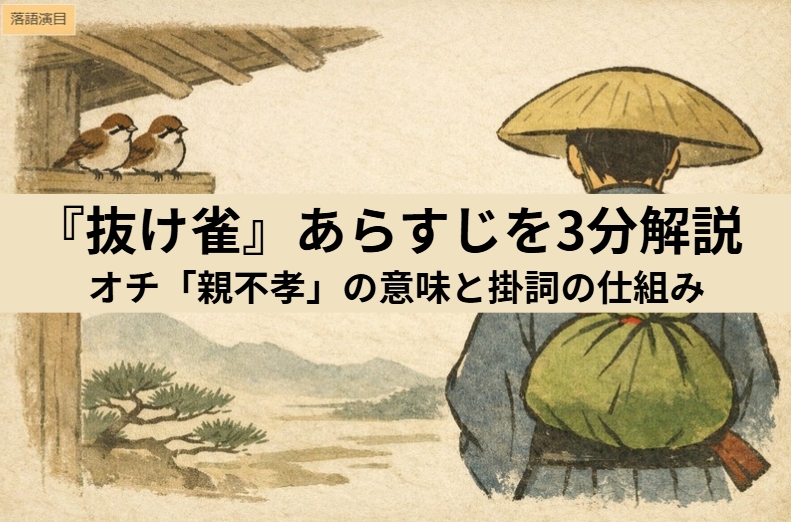 『抜け雀』は、サゲ(オチ)の仕組みを知ると一気にクリアになる噺です。この記事では、3分であらすじを整理し、最後の「親不孝」がなぜ成立するのかを“構造”で解説します。