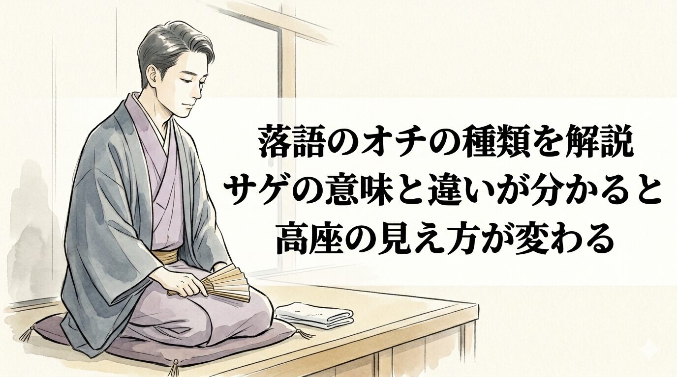 この記事では、落語のオチとサゲの違い、代表的な種類、実際の鑑賞でどう役立つかを整理します。名前を全部覚える必要はありません。まずは「この噺は、どう落としたのか」が見えれば十分です。