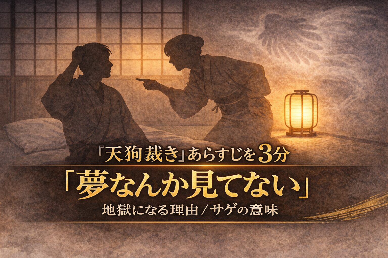 『天狗裁き』のあらすじとサゲ(オチ)の意味が知りたい方へ。本記事では3分で物語の全体像と、「夢なんか見てない」が、なぜ“全員のスイッチ”を押してしまうのかを整理します。