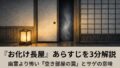 名付けの相談から始まり、縁起のいい言葉を全部つないだ結果、たんこぶ騒動で長い名前の不便さが露出する『寿限無』。あらすじ、オチの意味、見どころを通して、なぜこの噺が「長い名前」以上に「善意の盛りすぎ」の話として残るのかがわかります。